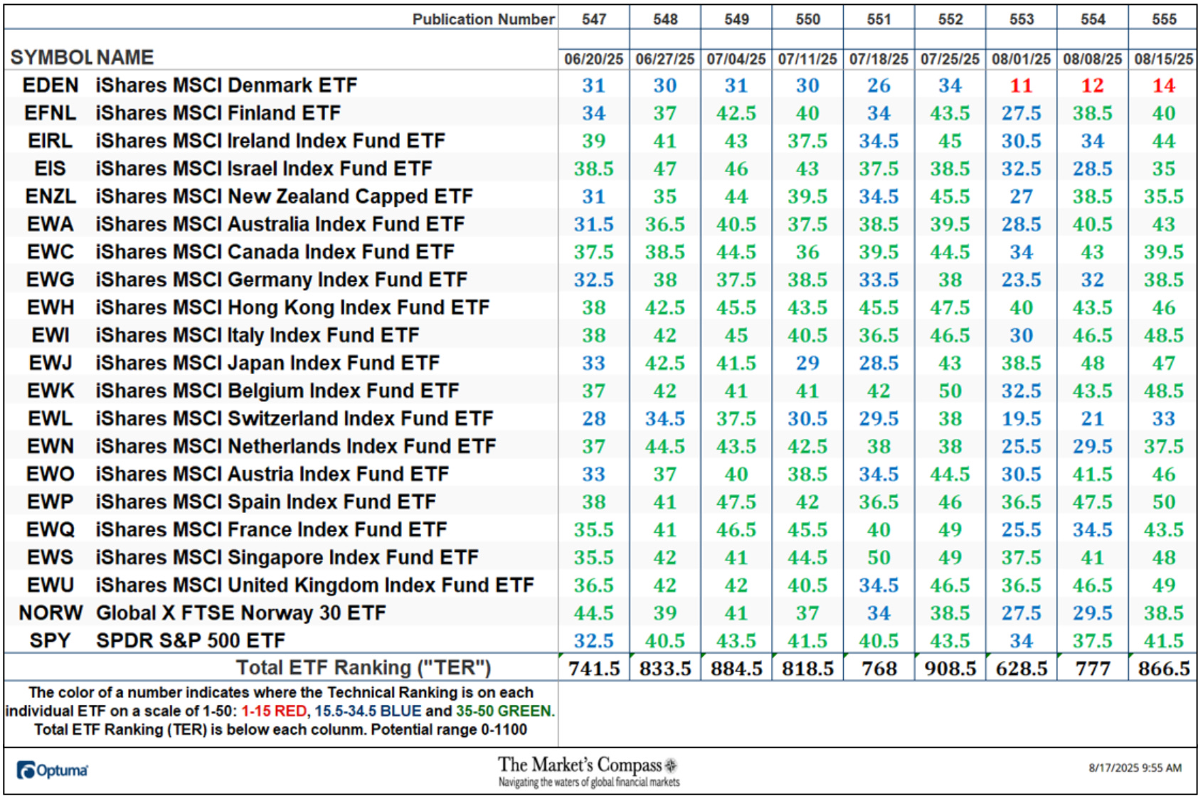 Welcome to this week’s publication of the Market’s Compass Developed Markets Country (DMC) ETF Study #555. It highlights the technical changes of the 21 DM Country ETFs that I track on a weekly basis and publish every third week*. There are three ETF Studies that include the Market’s Compass US Index and Sector (USIS) ETF Study, the Developed Markets Co…